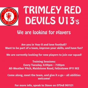 I hope that as many of you as possible will come along and support our TRD FC Seniors 1st Team in their Suffolk FA Senior Cup Final match. Please note there will be an admission charge, see link below for details: Portman Road cup final ticket details – Suffolk FA Let’s try and get the whole club behind our Team as they try and retain their title and trophy! I look forward to seeing you next Friday Evening at the Cup Final. Mel West Chairman, Trimley Red Devils Football Club
